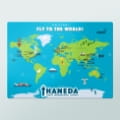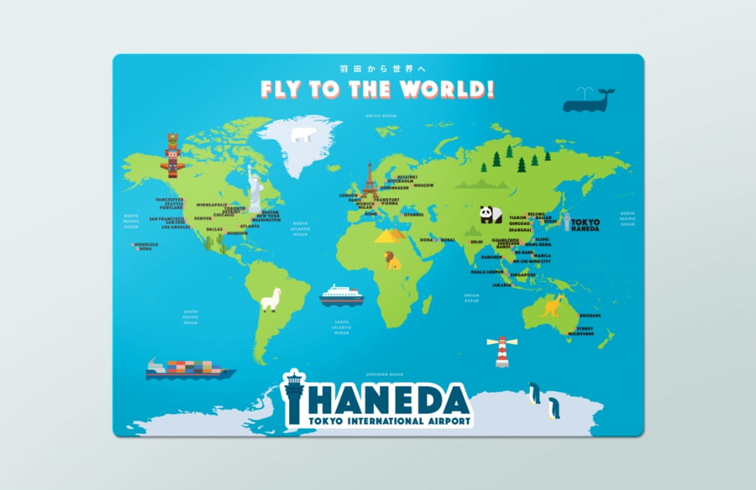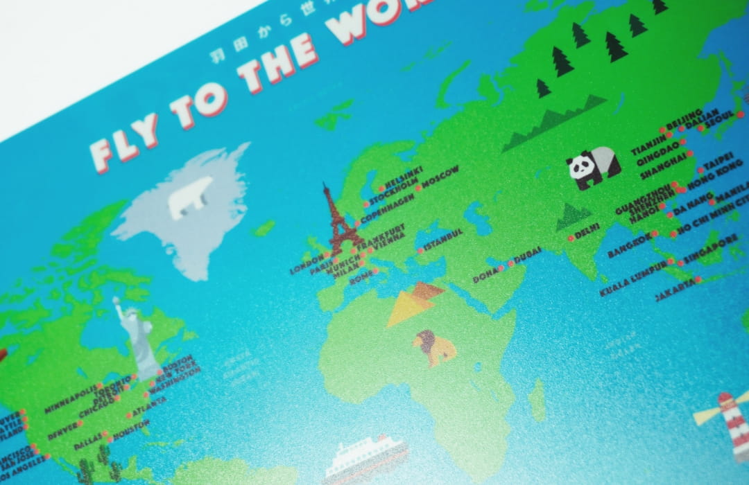 表面は就航都市を記載した北米視点の世界地図、